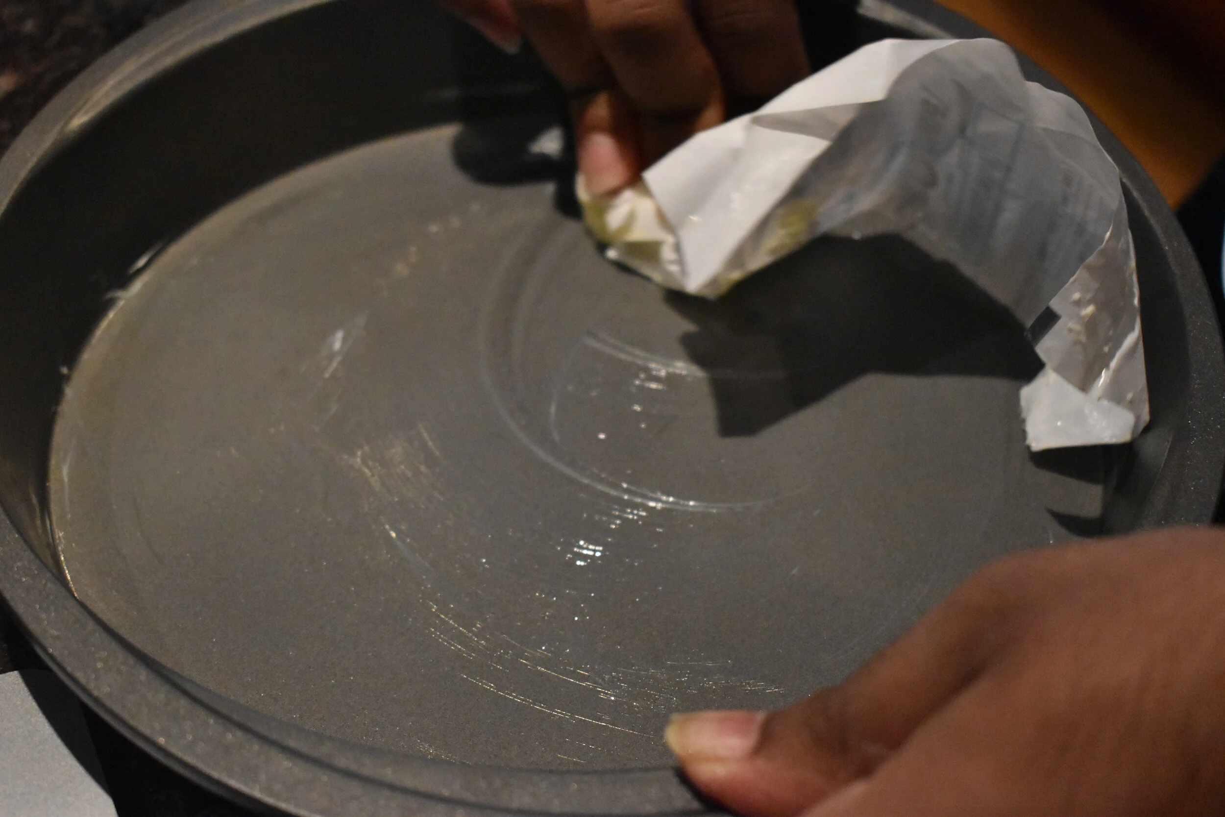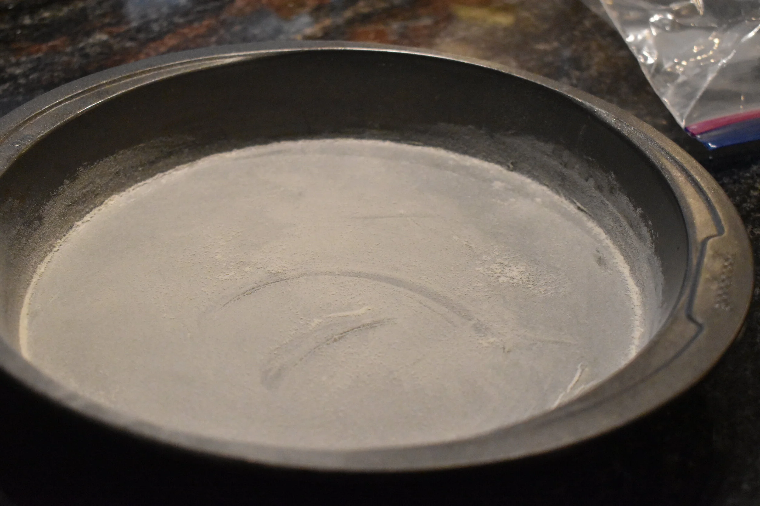 9. Grease a 9” baking tin and dust with a tablespoon of flour. Dust off excess flour.